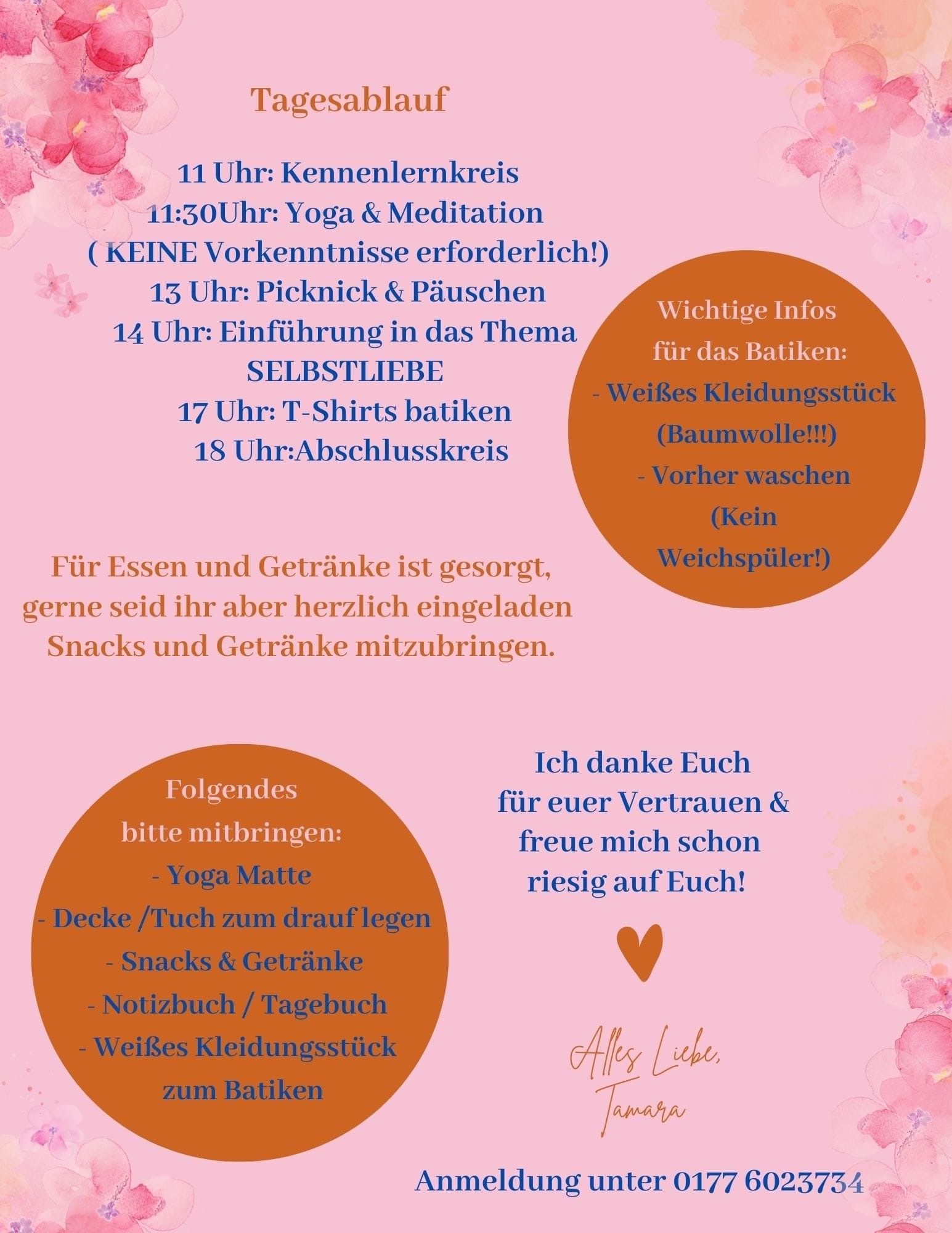 Teilnehmerinnen werden gebeten, eine Yoga-Matte, eine Decke oder ein Tuch zum Sitzen oder Liegen, ein Notiz- oder Tagebuch sowie Snacks und Getränke mitzubringen. Für das Batiken ist ein weißes Kleidungsstück aus Baumwolle notwendig – bitte vorher waschen, jedoch ohne Weichspüler.