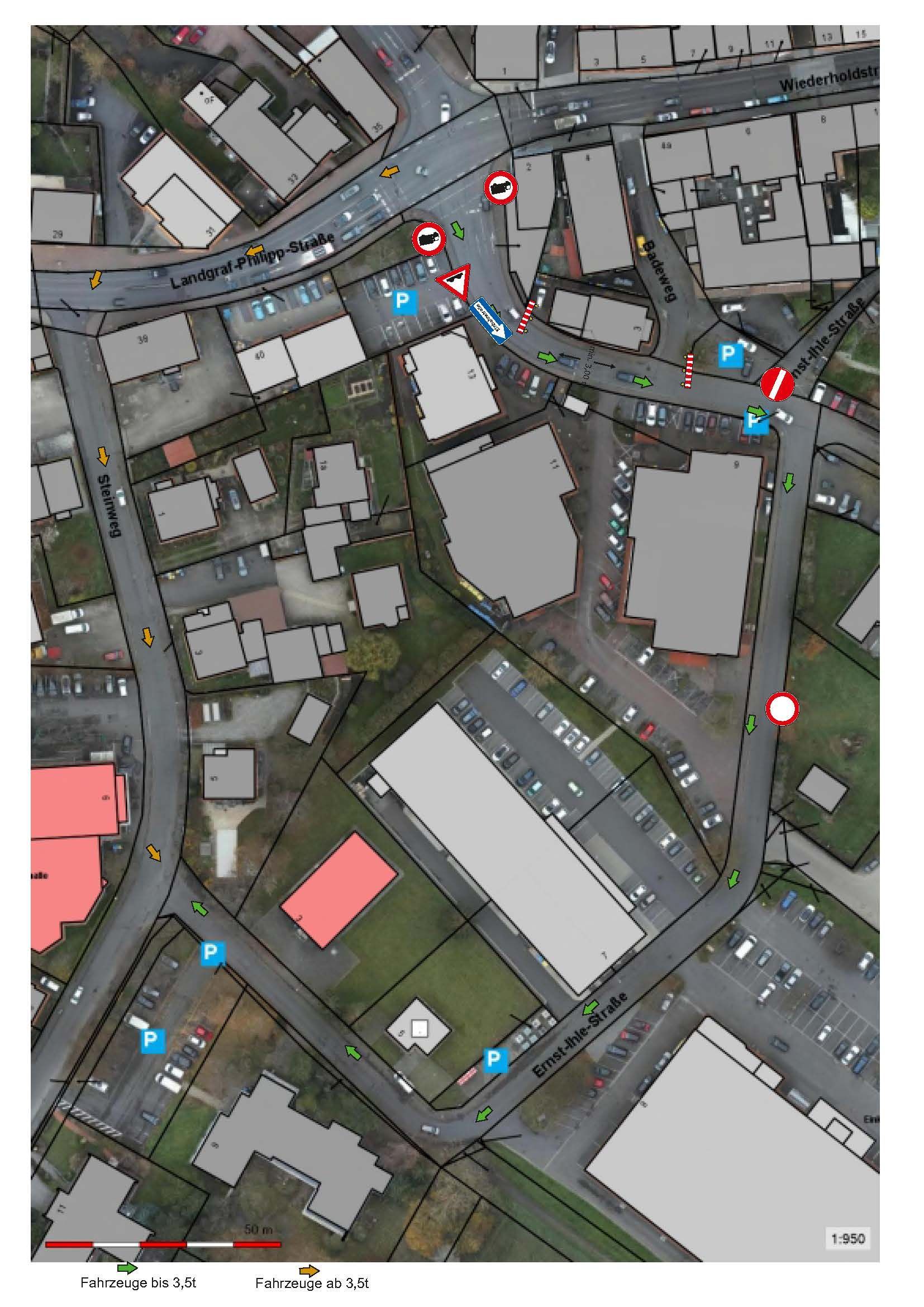 • Verkehrsführung für Lkw über 3,5 t: Schwerlastverkehr kann die Ernst-Ihle-Straße während der Arbeiten nicht von der Kreuzung aus befahren. Die Zufahrt zu den Händlern erfolgt ausschließlich über den Steinweg.