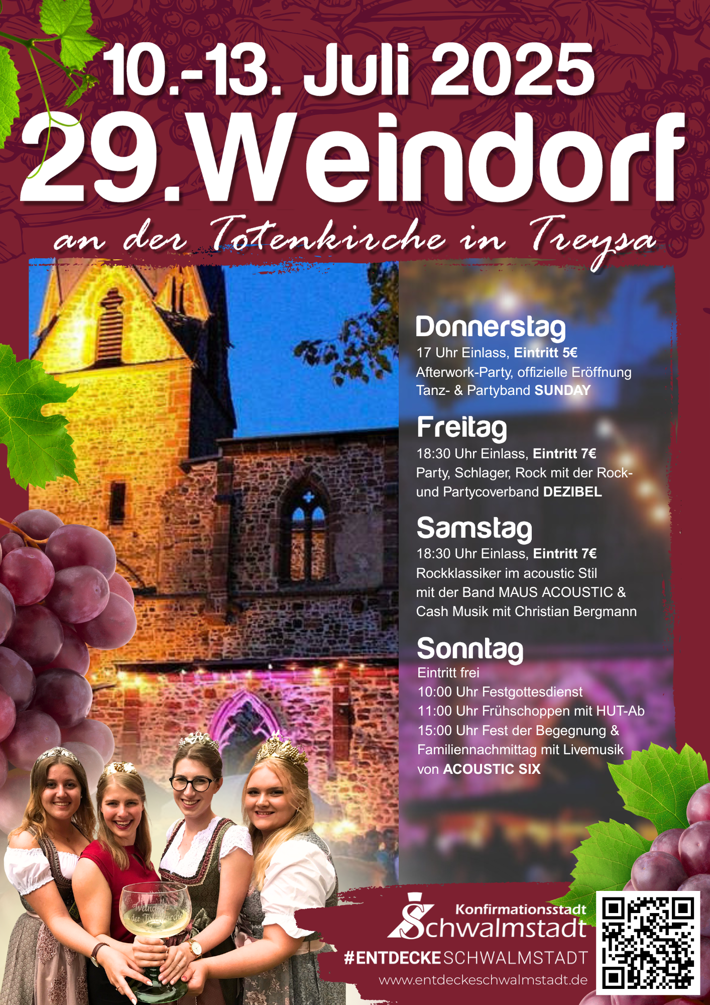 Das Weindorf an der Totenkirche hat seit dem Hessentag 1995 einen festen Platz im Veranstaltungskalender von Schwalmstadt gefunden und findet regelmäßig am zweiten Juli-Wochenende statt. Für Viele ist es das schönste Fest des Jahres, was auch die große Zahl an Stammbesuchern unterstreicht. In diesem Jahr findet es bereits zum 29. Male statt.